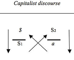 The move from $ to S1 reflects a denial of the structural quality of subjective division. On the one hand the capitalist discourse starts from subjective division, yet, on the other hand the move toward S1 suggests that subjective division might be overcome through alienation in a master signifier.