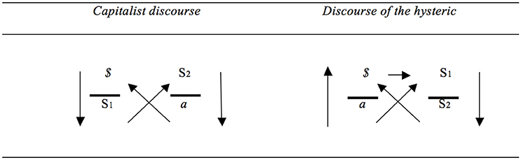 Moreover, the switch between S1 and $ reveals something about what is taken seriously. In the discourse of the master, it is a signifier that is taken seriously: an S1 is adopted, and around this signifier a world of semblance is created through which the other and jouissance are addressed, which is what the upper horizontal arrow indicates. In the discourse of the capitalist, by contrast, it is discontent that is taken seriously. In this respect, the capitalist discourse resembles the discourse of the hysteric.