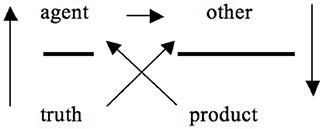 The arrow pointing downwards (right side of Figure 1) indicates that the agent’s address to the other has effects: a “product” is created. This product fuels the agent, but occupies a disjunctive position in relation to the truth that set the discourse in motion.