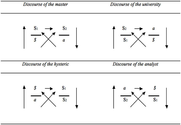 In most discussions of surplus-jouissance, Lacan starts from the master discourse. In the discourse of the master the object a is the surplus that the semblant is confronted with. Yet, in terms of Lacan’s later discussions of the structure of discourse (Figure 3), surplus-jouissance is not identical to the object a, but the end position of each discourse (Lacan, 1971–1972, p. 193). In the discourse of the university the divided subject occupies this place; in the discourse of the hysteric it is unconscious knowledge that emerges; and in the discourse of the analyst the master signifier makes up the surplus-jouissance.