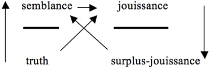 In explaining surplus-jouissance, Lacan points to the joke. As we speak we invariably also utter nonsense, and because of this we laugh. Yet, why exactly does the joke provoke laughter? Lacan (1968–1969, p. 64, my translation) suggests the following: “it [the joke] provokes laughter, in the end, to the extent that it is actually hooked to the failure inherent to knowledge.” The pursuit of meaning through speech implies deadlocks. Speech is always a half-saying (mi-dire). It misses its point, and this failure coincides with a dose of jouissance, to which laughter bears witness. Consequently, surplus-jouissance has a status of lack and loss (Tomšič, 2015)—language use always misses the point; expressed by downward arrow in the formulae for discourse—and at the same time makes discourse function as an endless attempt to get hold of what one misses; expressed by the diagonal arrow from surplus-jouissance/product to semblance/agent. Furthermore, by connecting the manifestation of surplus-jouissance to laughter and misrepresentation, Lacan situates surplus-jouissance at the level of the unconscious (Lacan, 1971, p. 21). In Marx’s production system the capitalist laughs with the money the system generates; in Lacan’s model the user of discourse laughs to the extent that, at the level of the unconscious, a surplus of jouissance is produced which one fails to get hold of. The unconscious concerns the combined expression of half-saying and surplus-jouissance.