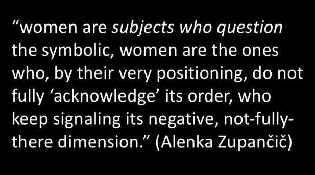 Alenka Zupančič: Yes, when we understand the question ‘why Freud and Lacan?’, or the question ‘why psychoanalysis?’, we come close to an understanding of the paradigmatic role which a revised notion of ‘sexuality’ must play in this discussion. Joan Copjec succinctly pointed out how, for example, in the term ‘sexual difference’ the term ‘sex’ has been replaced by the more neutered category of ‘gender’. As Joan – an allied member of the ‘Ljubljana School’ – put it: Gender theory performed one major feat: it removed the sex from sex. For awhile, gender theorists continued to speak of sexual practices, they ceased to question what sex or sexuality is; sex was no longer the subject of an ontological inquiry and reverted instead to being what it was in common parlance: some vague sort of distinction, but basically a secondary characteristic (when applied to the subject), a qualifier added to others, or (when applied to an act) something a bit naughty.